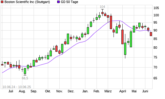 Mit dem Rücksetzer auf 88,40 EUR hat die Boston Scientific-Aktie am 09.06.2025 die 50-Tage-Linie nach unten gekreuzt.