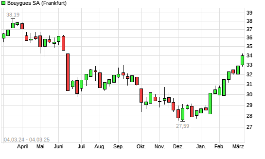 Mit dem Anstieg auf 33,37 EUR hat die Bouygues-Aktie (ISIN FR0000120503) am 03.03.2025 ein neues 6-Monats-Hoch erreicht und damit den Kurs vom 28.02.2025 eingestellt.
