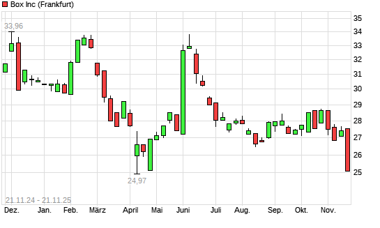 Mit dem Rücksetzer auf 25,33 EUR hat die Box-Aktie (ISIN US10316T1043) am 20.11.2025 ein neues 6-Monats-Tief erreicht und damit den Kurs vom 19.11.2025 eingestellt.