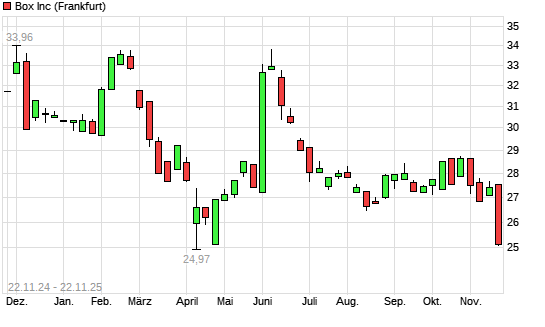 Mit dem Rücksetzer auf 25,09 EUR hat die Box-Aktie (ISIN US10316T1043) am 21.11.2025 ein neues 6-Monats-Tief erreicht und damit den Kurs vom 20.11.2025 eingestellt.