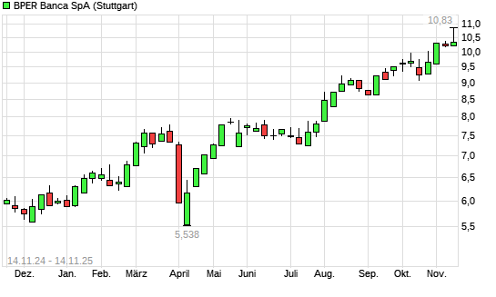 Mit dem Anstieg auf 10,85 EUR hat die Bper Banca-Aktie (ISIN IT0000066123) am 13.11.2025 ein neues All-Time-High erreicht und damit den Kurs vom 12.11.2025 eingestellt.