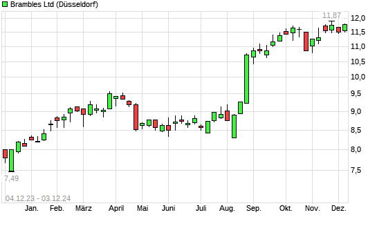 Mit dem Anstieg auf 12,00 EUR hat die Brambles-Aktie (ISIN AU000000BXB1) am 02.12.2024 ein neues All-Time-High erreicht und damit den Kurs vom 19.11.2024 eingestellt.