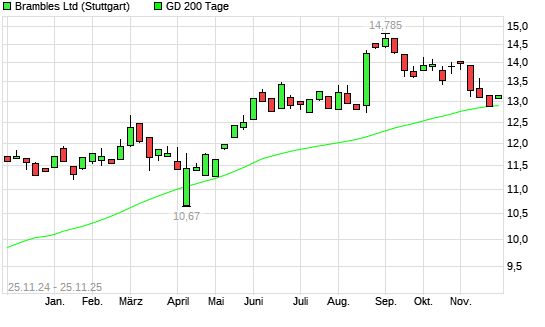 Mit dem Anstieg auf 12,98 EUR hat die Brambles-Aktie am 24.11.2025 die 200-Tage-Linie nach oben gekreuzt.