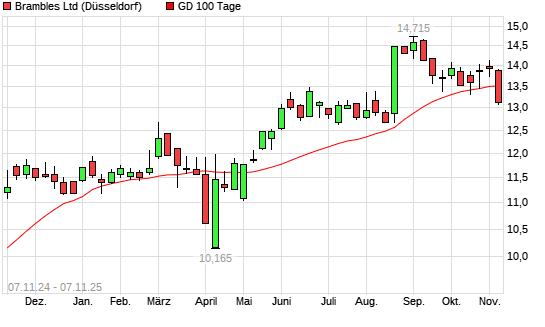 Mit dem Rücksetzer auf 13,23 EUR hat die Brambles-Aktie am 06.11.2025 die 100-Tage-Linie nach unten gekreuzt.