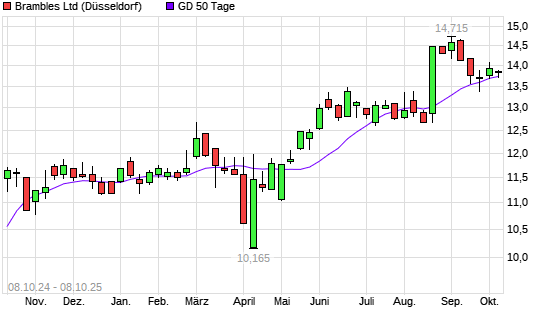 Die Brambles-Aktie befindet sich seit dem 30.04.2025 im langfristigen Aufwärtstrend und hat in diesem Zeitraum +22,18% an Wert gewonnen. Der Abstand zur 200-Tage-Linie beträgt aktuell +9,88%.