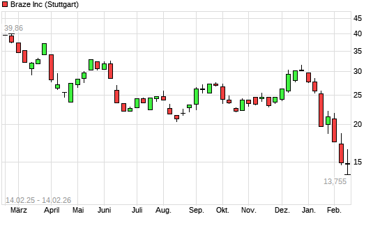 Mit dem Rücksetzer auf 14,44 EUR hat die Braze-Aktie (ISIN US10576N1028) am 13.02.2026 ein neues All-Time-Low erreicht und damit den Kurs vom 12.02.2026 eingestellt.