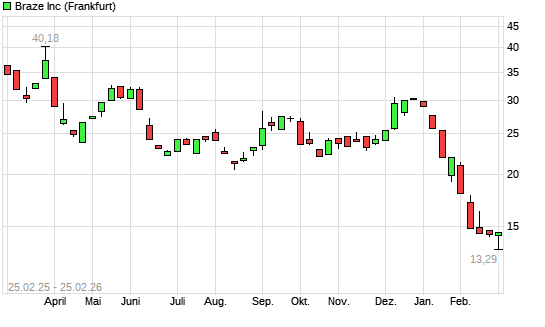Mit dem Rücksetzer auf 13,29 EUR hat die Braze-Aktie (ISIN US10576N1028) am 24.02.2026 ein neues All-Time-Low erreicht und damit den Kurs vom 18.02.2026 eingestellt.