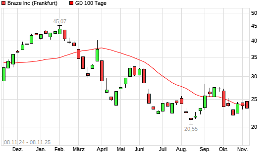 Mit dem Rücksetzer auf 23,29 EUR hat die Braze-Aktie am 07.11.2025 die 100-Tage-Linie nach unten gekreuzt.