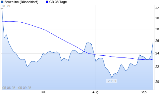 Mit dem Rücksetzer auf 22,95 EUR hat die Braze-Aktie am 04.09.2025 die 38-Tage-Linie nach unten gekreuzt.