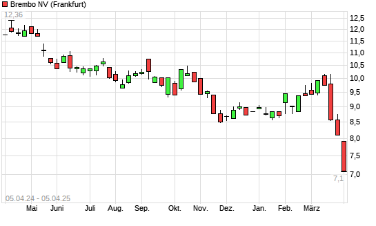 Mit dem Rücksetzer auf 7,10 EUR hat die Brembo-Aktie (ISIN NL0015001KT6) am 04.04.2025 ein neues 3-Jahres-Tief erreicht und damit den Kurs vom 03.04.2025 eingestellt.