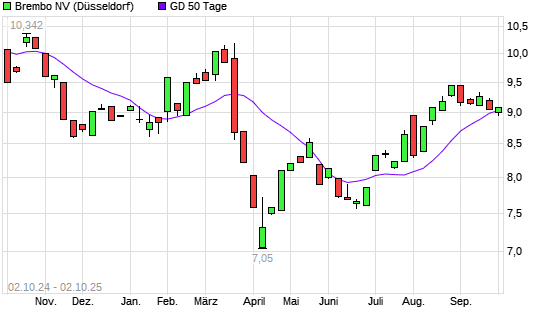 Mit dem Rücksetzer auf 8,84 EUR hat die Brembo-Aktie am 01.10.2025 die 50-Tage-Linie nach unten gekreuzt.