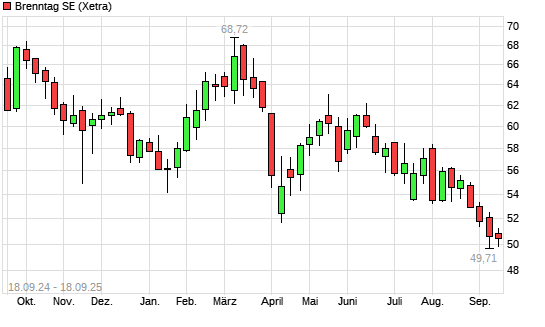Mit dem Rücksetzer auf 49,98 EUR hat die Brenntag-Aktie (ISIN DE000A1DAHH0) am 17.09.2025 ein neues 5-Jahres-Tief erreicht und damit den Kurs vom 10.09.2025 eingestellt.