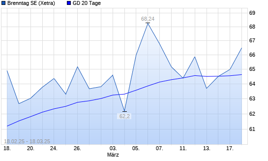 Mit dem Anstieg auf 65,30 EUR hat die Brenntag-Aktie am 17.03.2025 die 20-Tage-Linie nach oben gekreuzt.