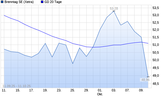 Mit dem Rücksetzer auf 49,33 EUR hat die Brenntag-Aktie am 10.10.2025 die 20-Tage-Linie nach unten gekreuzt.