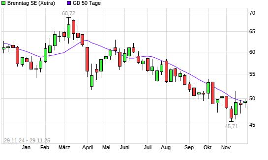 Mit dem Rücksetzer auf 49,37 EUR hat die Brenntag-Aktie am 28.11.2025 die 50-Tage-Linie nach unten gekreuzt.