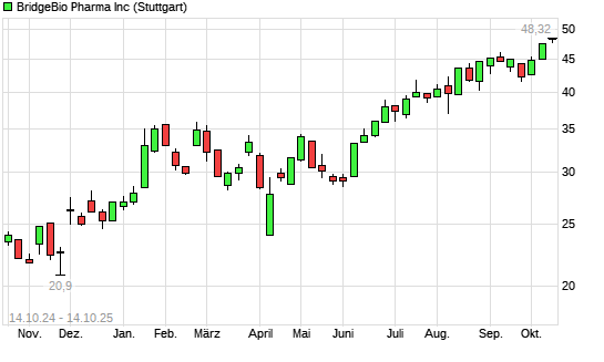 Mit dem Anstieg auf 48,15 EUR hat die BridgeBio Pharma-Aktie (ISIN US10806X1028) am 13.10.2025 ein neues 3-Jahres-Hoch erreicht und damit den Kurs vom 09.10.2025 eingestellt.