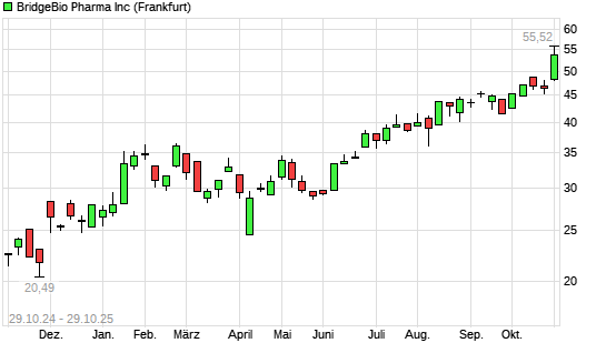 Mit dem Anstieg auf 55,74 EUR hat die BridgeBio Pharma-Aktie (ISIN US10806X1028) am 28.10.2025 ein neues 3-Jahres-Hoch erreicht und damit den Kurs vom 15.10.2025 eingestellt.