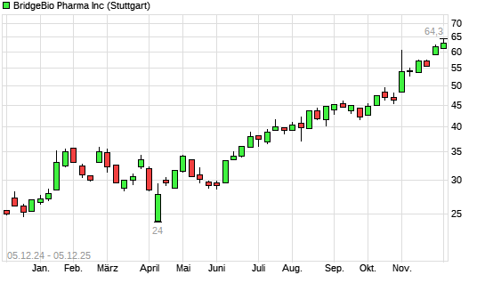 Mit dem Anstieg auf 63,18 EUR hat die BridgeBio Pharma-Aktie (ISIN US10806X1028) am 04.12.2025 ein neues All-Time-High erreicht und damit den Kurs vom 02.12.2025 eingestellt.
