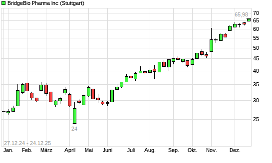 Mit dem Anstieg auf 64,98 EUR hat die BridgeBio Pharma-Aktie (ISIN US10806X1028) am 23.12.2025 ein neues All-Time-High erreicht und damit den Kurs vom 22.12.2025 eingestellt.