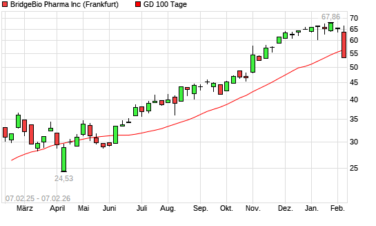 Mit dem Rücksetzer auf 55,08 EUR hat die BridgeBio Pharma-Aktie am 06.02.2026 die 100-Tage-Linie nach unten gekreuzt.