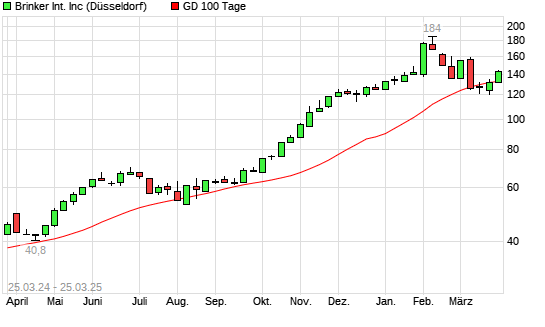 Mit dem Anstieg auf 144,00 EUR hat die Brinker International-Aktie am 24.03.2025 die 100-Tage-Linie nach oben gekreuzt.