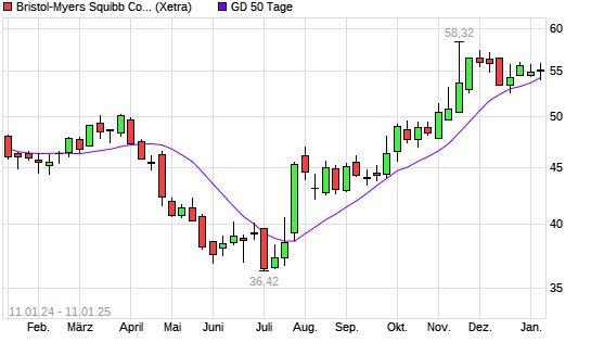 Mit dem Rücksetzer auf 54,23 EUR hat die Bristol-Myers-Aktie am 10.01.2025 die 50-Tage-Linie nach unten gekreuzt.