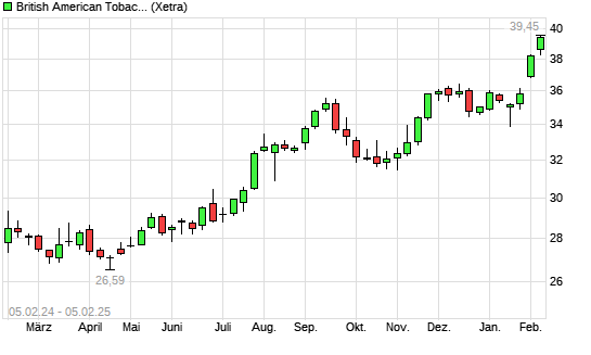 Mit dem Anstieg auf 38,73 EUR hat die British American Tobacco-Aktie (ISIN GB0002875804) am 04.02.2025 ein neues 12-Monats-Hoch erreicht und damit den Kurs vom 03.02.2025 eingestellt.