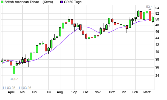 Mit dem Anstieg auf 51,70 EUR hat die British American Tobacco-Aktie am 10.03.2026 die 50-Tage-Linie nach oben gekreuzt.
