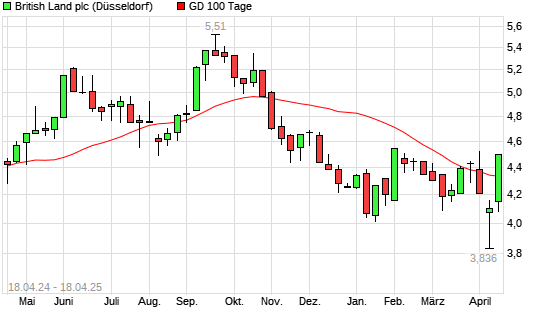 Mit dem Anstieg auf 4,58 EUR hat die British Land-Aktie am 17.04.2025 die 100-Tage-Linie nach oben gekreuzt.