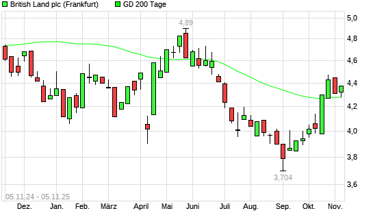 Mit dem Rücksetzer auf 4,28 EUR hat die British Land-Aktie am 04.11.2025 die 200-Tage-Linie nach unten gekreuzt.