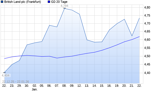 Mit dem Rücksetzer auf 4,62 EUR hat die British Land-Aktie am 21.01.2026 die 20-Tage-Linie nach unten gekreuzt.Die British Land-Aktie befindet sich seit dem 26.11.2025 ...weiterlesen