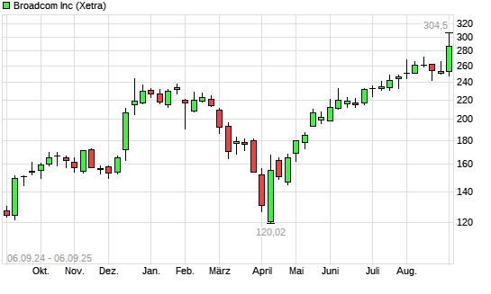Mit dem Anstieg auf 284,95 EUR hat die Broadcom-Aktie (ISIN US11135F1012) am 05.09.2025 ein neues All-Time-High erreicht und damit den Kurs vom 12.08.2025 eingestellt.