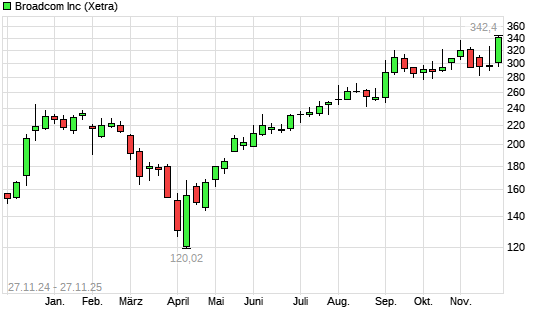 Mit dem Anstieg auf 346,45 EUR hat die Broadcom-Aktie (ISIN US11135F1012) am 26.11.2025 ein neues All-Time-High erreicht und damit den Kurs vom 29.10.2025 eingestellt.