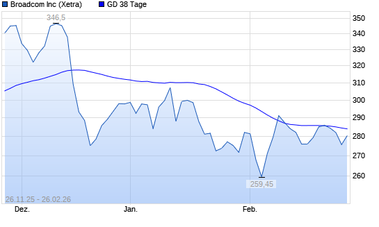 Mit dem Anstieg auf 285,55 EUR hat die Broadcom-Aktie am 25.02.2026 die 38-Tage-Linie nach oben gekreuzt.