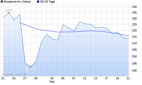 Mit dem Rücksetzer auf 215,10 EUR hat die Broadcom-Aktie am 20.02.2025 die 20-Tage-Linie nach unten gekreuzt.