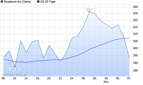 Mit dem Rücksetzer auf 300,00 EUR hat die Broadcom-Aktie am 07.11.2025 die 20-Tage-Linie nach unten gekreuzt.