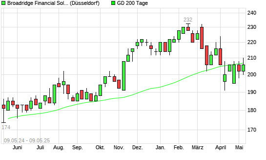 Mit dem Anstieg auf 210,00 EUR hat die Broadridge Financial-Aktie am 08.05.2025 die 200-Tage-Linie nach oben gekreuzt.