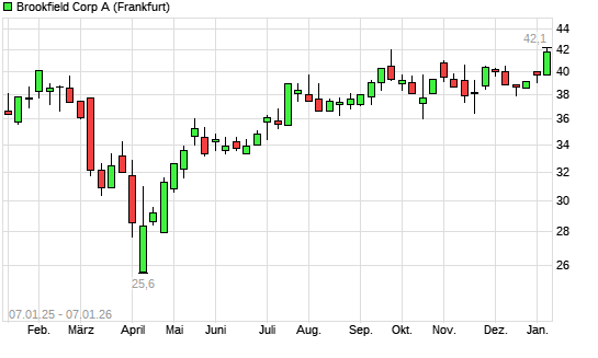 Mit dem Anstieg auf 42,10 EUR hat die Brookfield Asset Management-Aktie (ISIN CA11271J1075) am 06.01.2026 ein neues All-Time-High erreicht und damit den Kurs vom 23.09.2025 eingestellt.
