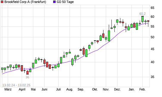 Mit dem Rücksetzer auf 55,80 EUR hat die Brookfield Asset Management-Aktie am 12.02.2025 die 50-Tage-Linie nach unten gekreuzt.