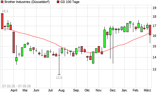 Mit dem Anstieg auf 16,60 EUR hat die Brother Industries-Aktie am 06.03.2026 die 100-Tage-Linie nach oben gekreuzt.