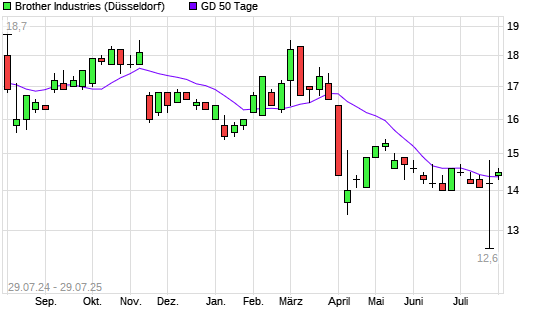 Mit dem Rücksetzer auf 14,40 EUR hat die Brother Industries-Aktie am 28.07.2025 die 50-Tage-Linie nach unten gekreuzt.
