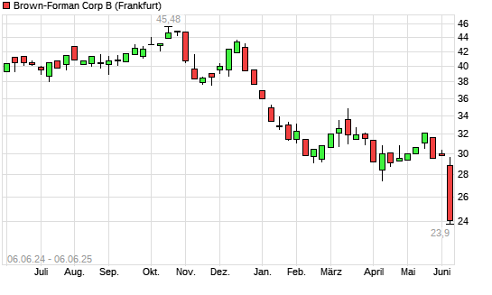 Mit dem Rücksetzer auf 23,90 EUR hat die Brown-Forman B-Aktie (ISIN US1156372096) am 05.06.2025 ein neues 10-Jahres-Tief erreicht und damit den Kurs vom 16.04.2025 eingestellt.