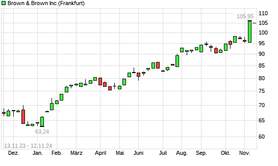 Mit dem Anstieg auf 104,75 EUR hat die Brown & Brown-Aktie (ISIN US1152361010) am 11.11.2024 ein neues All-Time-High erreicht und damit den Kurs vom 07.11.2024 eingestellt.