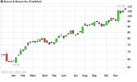 Mit dem Anstieg auf 108,15 EUR hat die Brown & Brown-Aktie (ISIN US1152361010) am 27.11.2024 ein neues All-Time-High erreicht und damit den Kurs vom 25.11.2024 eingestellt.