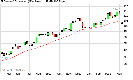 Mit dem Rücksetzer auf 99,00 EUR hat die Brown & Brown-Aktie am 07.04.2025 die 100-Tage-Linie nach unten gekreuzt.