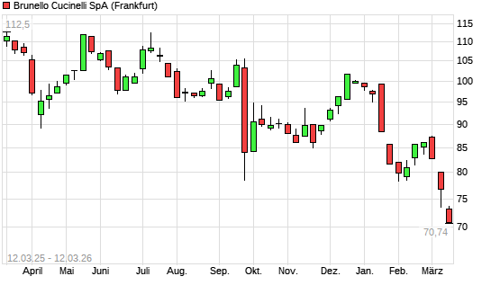 Mit dem Rücksetzer auf 72,94 EUR hat die Brunello Cucinelli-Aktie (ISIN IT0004764699) am 11.03.2026 ein neues 12-Monats-Tief erreicht und damit den Kurs vom 09.03.2026 eingestellt.