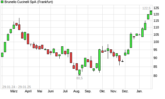Mit dem Anstieg auf 120,40 EUR hat die Brunello Cucinelli-Aktie (ISIN IT0004764699) am 28.01.2025 ein neues All-Time-High erreicht und damit den Kurs vom 24.01.2025 eingestellt.