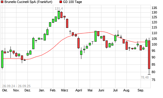 Mit dem Rücksetzer auf 87,42 EUR hat die Brunello Cucinelli-Aktie am 25.09.2025 die 100-Tage-Linie nach unten gekreuzt.