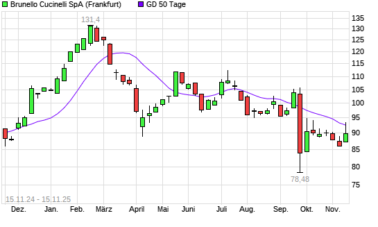 Mit dem Rücksetzer auf 89,80 EUR hat die Brunello Cucinelli-Aktie am 14.11.2025 die 50-Tage-Linie nach unten gekreuzt.