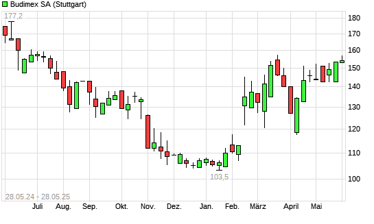 Mit dem Anstieg auf 158,00 EUR hat die Budimex-Aktie (ISIN PLBUDMX00013) am 27.05.2025 ein neues 6-Monats-Hoch erreicht und damit den Kurs vom 26.05.2025 eingestellt.